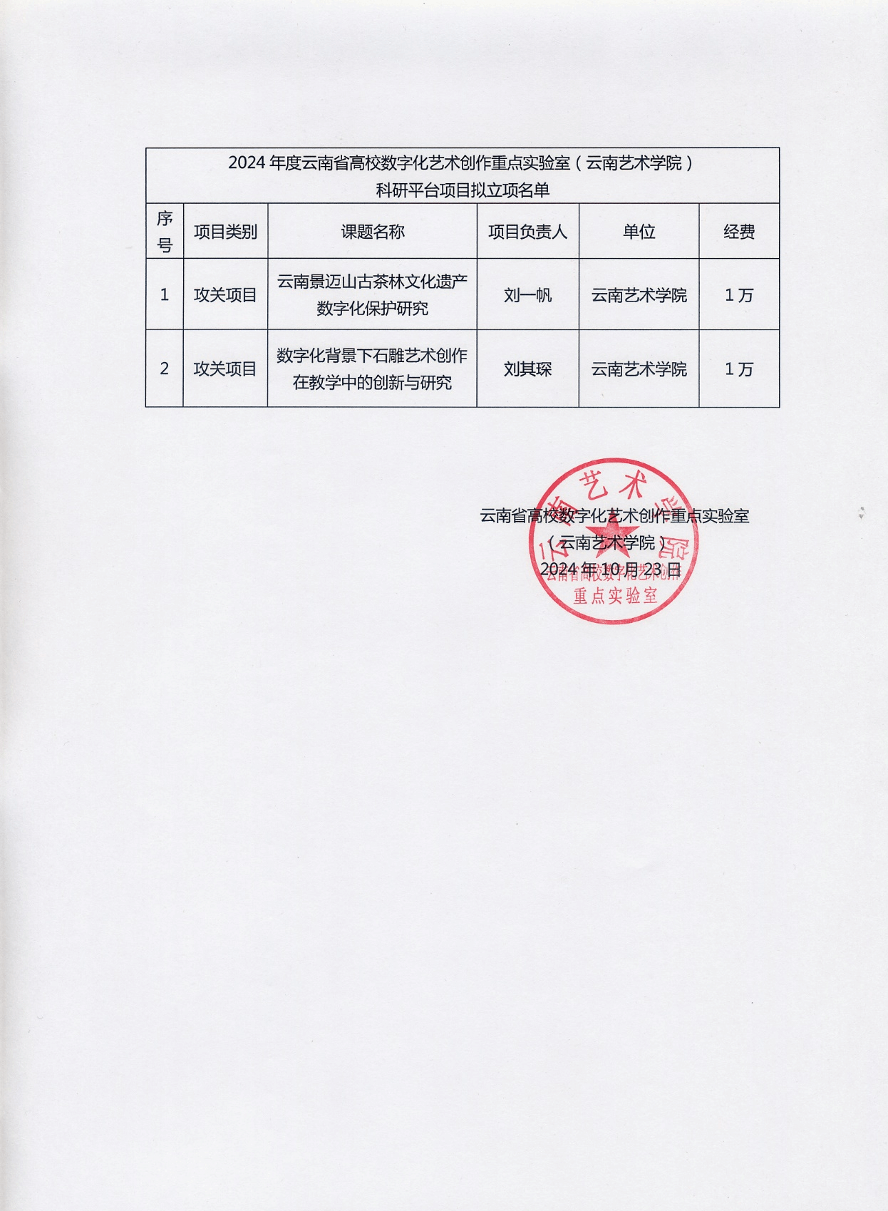 2024年度云南省高校数字化艺术创作重点实验室(伟德1949官网) 科研平台项目拟立项名单 |